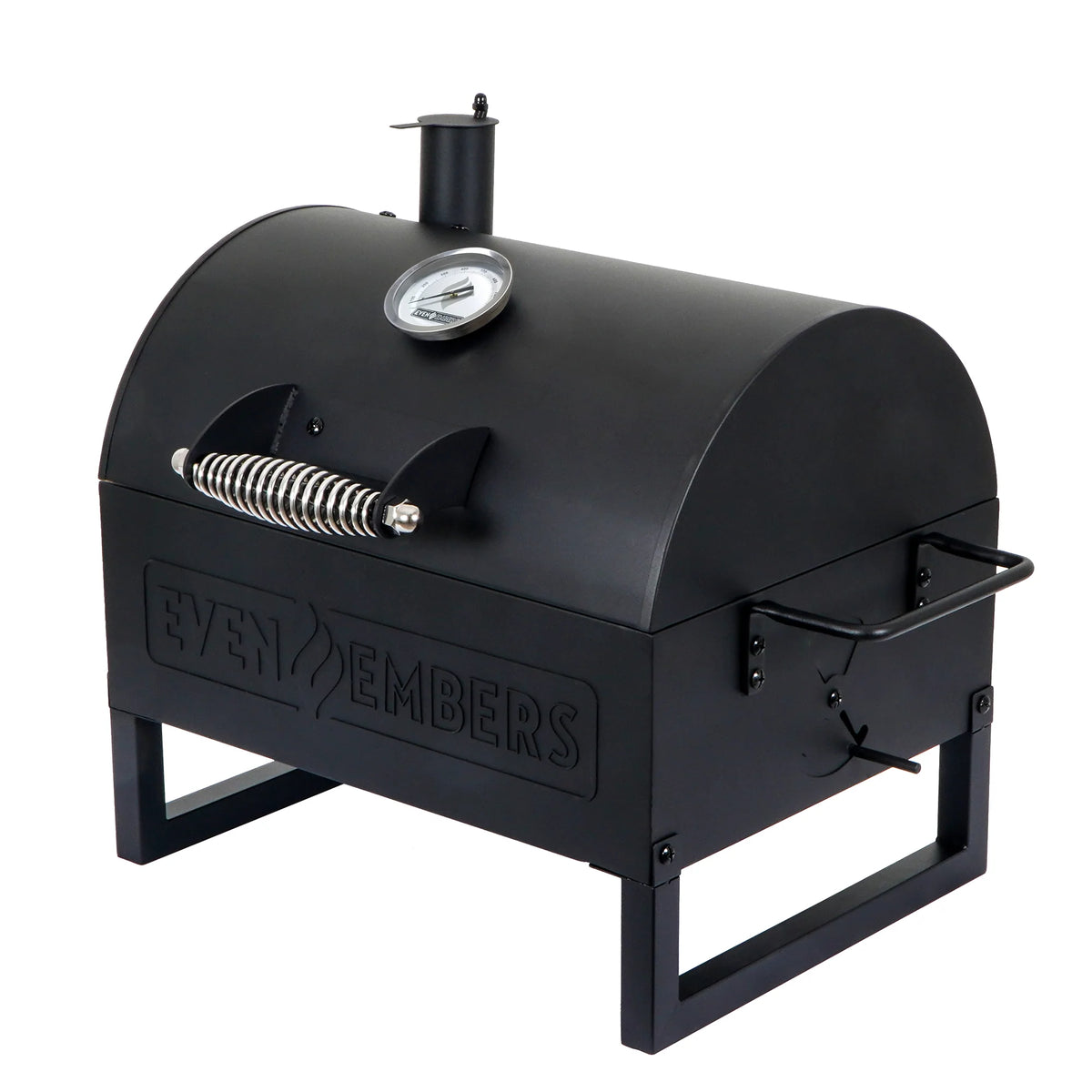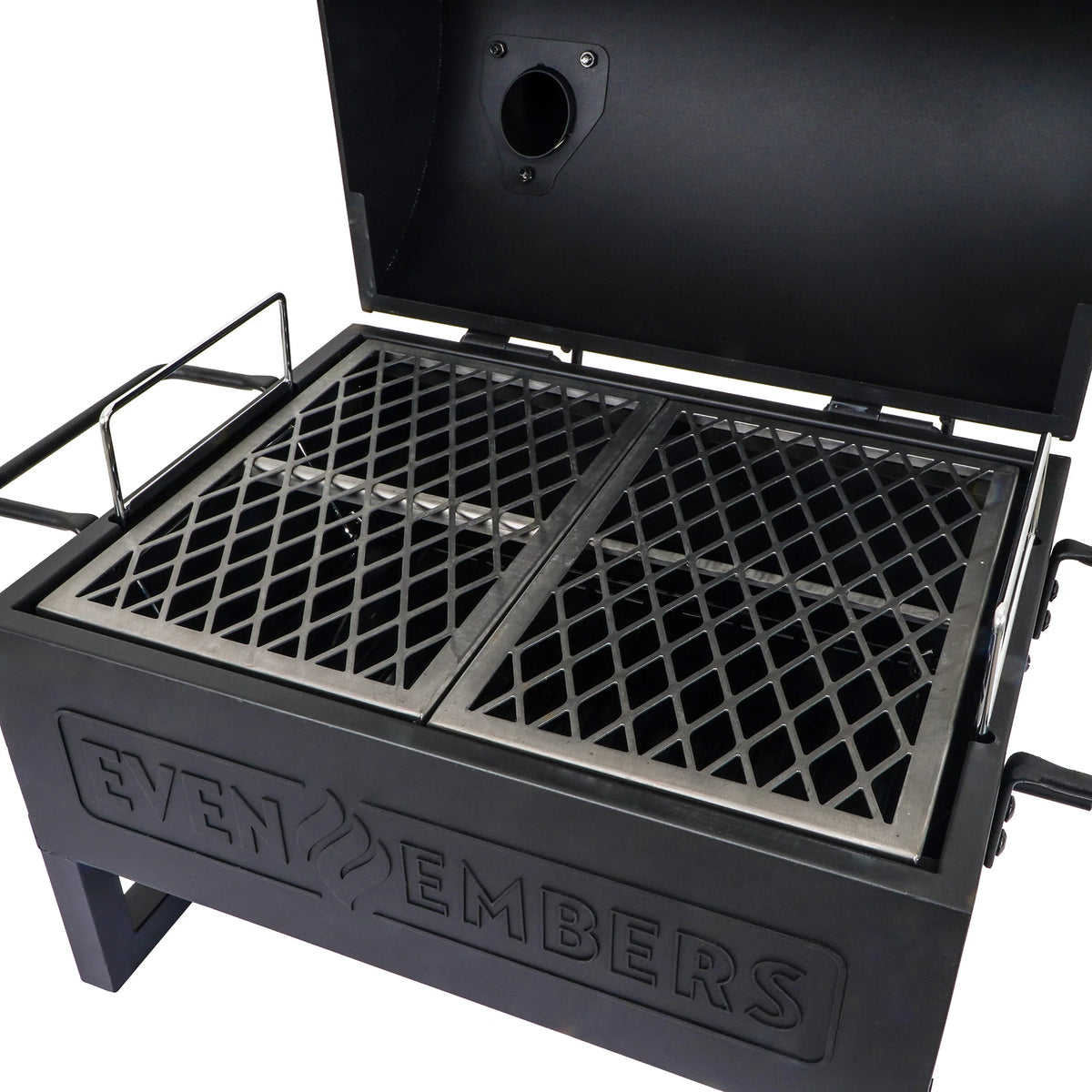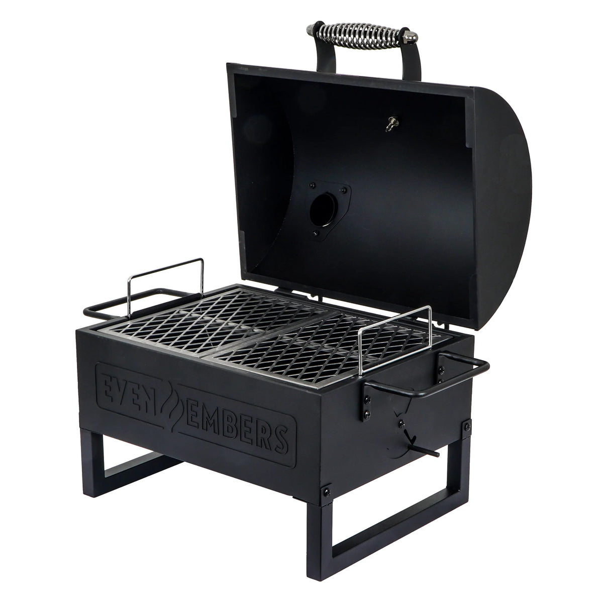 Compact, yet mighty, the Even Embers Tabletop Charcoal Grill offers 214 square inches of cooking space on heavy-duty pierced steel cooking grates. Cooking heat is in your control with an adjustable height charcoal grate, accessible air vent and easy to read temperature gauge. Side handles for portability make this Even Embers tabletop grill perfect for picnics on the go, camping, or backyard get-togethers.