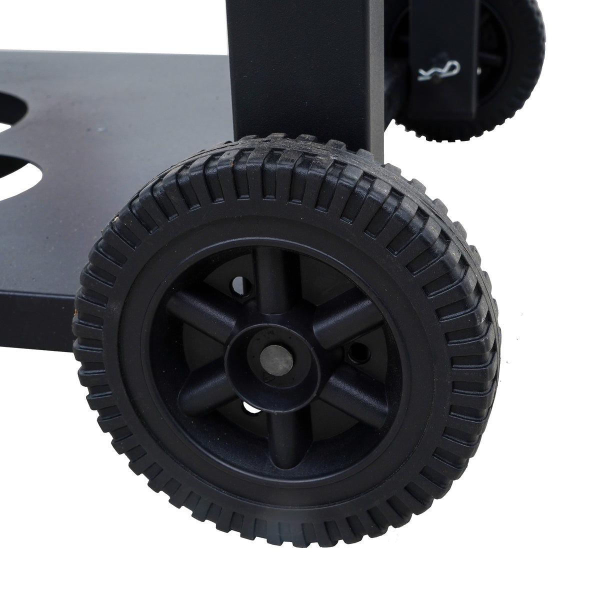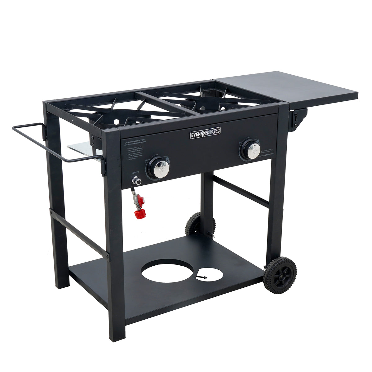 Built tough for outdoor cooking enthusiasts, the Even Embers 2-Burner Fryer Cart delivers powerful, professional-grade performance for all your frying favorites. With two 14 QT. aluminum frying pots and three frying baskets, you can easily fry up everything from wings to seafood with precision and speed. Dual burners with adjustable temperature control knobs produce an impressive 100,000 BTUs of heat, while the electronic ignition ensures quick and reliable startup every time. Equipped with two stainless steel thermometers, easily maintain accurate heat levels across both pots. Basket hangers and heat-resistant handles make handling food safe and easy, while the folding side shelf offers extra prep or storage space when you need it. Mounted on a rugged steel cart with two durable wheels, this fryer cart combines professional-grade performance with backyard-ready convenience.THIS APPLIANCE IS NOT FOR FRYING TURKEYS