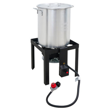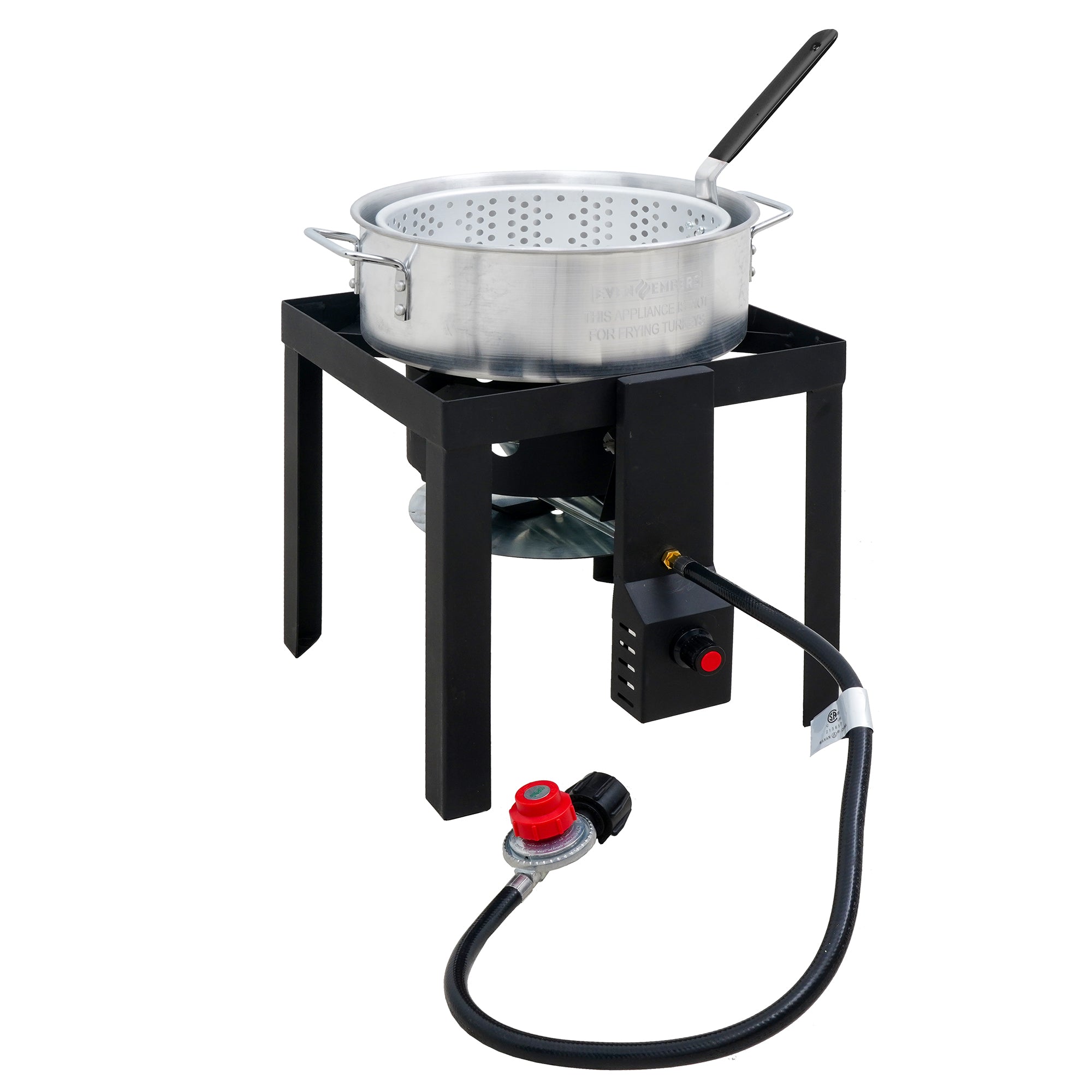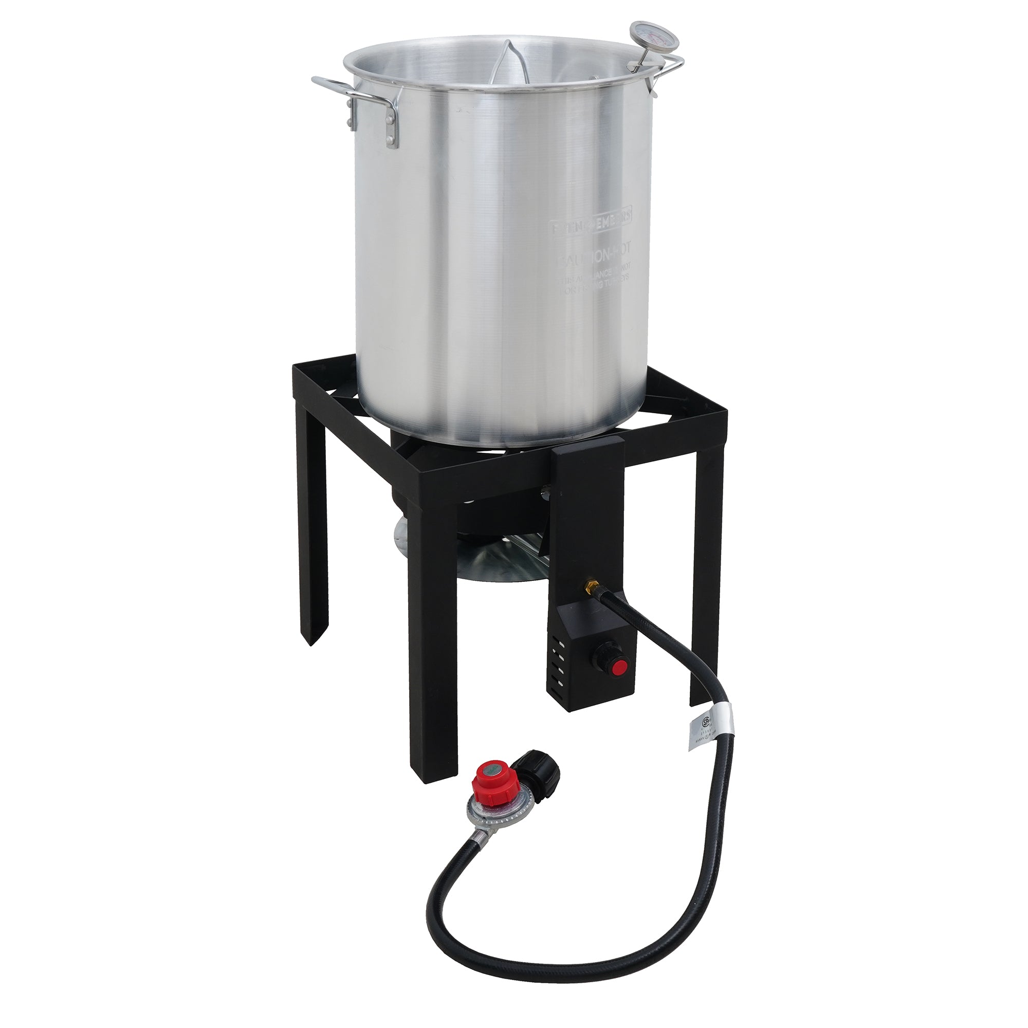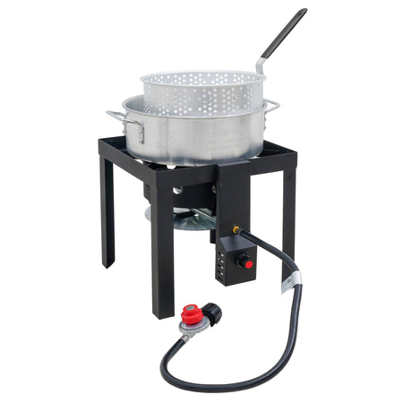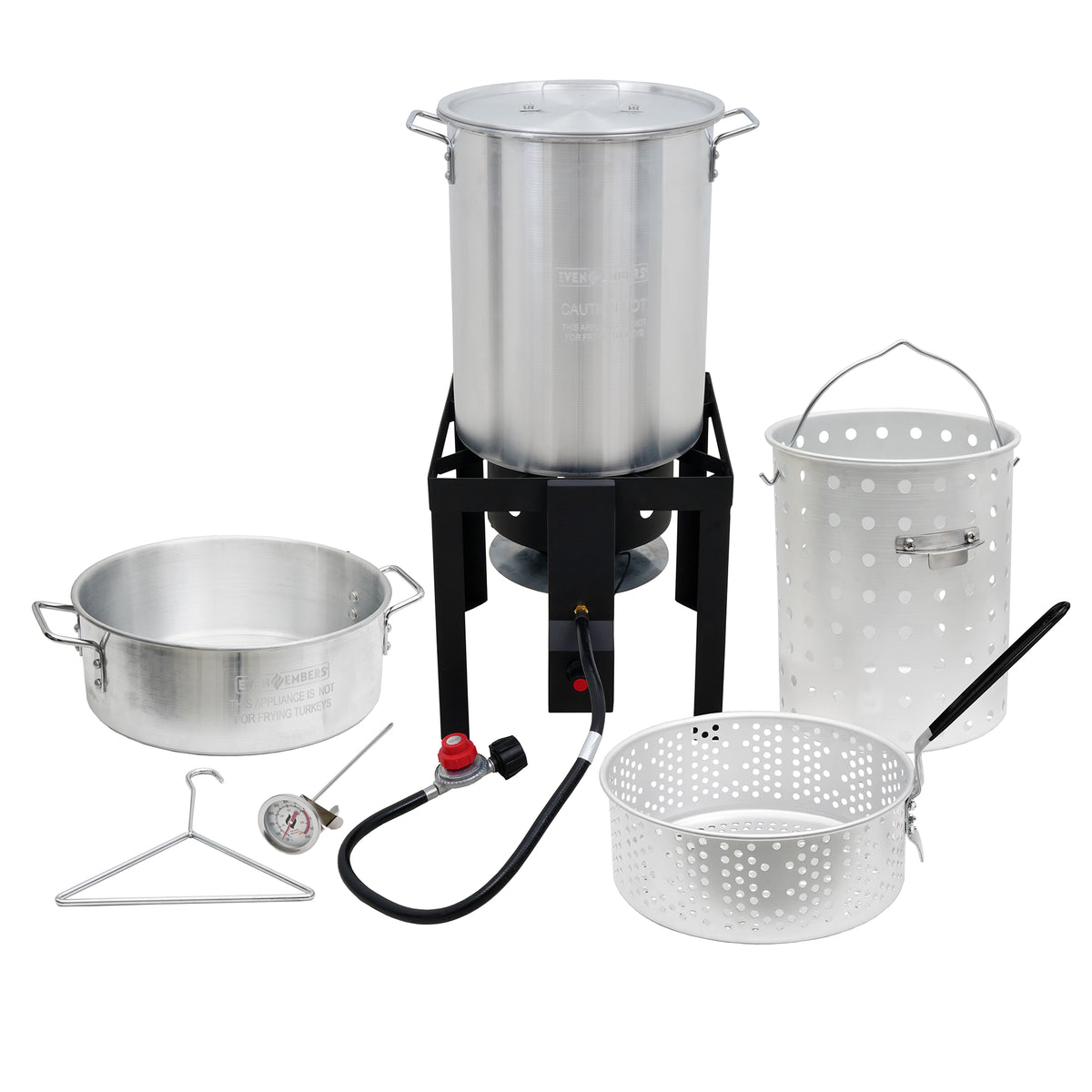 From backyard boils to fried feasts, the Even Embers Boiler/Fryer Kit has all the essentials to cook like a pro with ease. The kit includes both a 30 QT aluminum pot for larger gatherings and a 10 QT pot for smaller batches, each with a durable boiling/frying basket for easy food handling. Built on a heavy-gauge steel stand and powered by a 58,000 BTU high-efficiency burner, this cooker delivers fast, consistent heat. The 10 PSI adjustable gas regulator ensures precise temperature control, while the easy-to-use electronic ignition provides quick, reliable starts. Complete with a stainless steel thermometer and chrome-plated lifting hook, this kit ensures every meal is cooked safely and with precision. Whether it's a backyard fish fry, a crawfish boil, or a weekend tailgate, Even Embers helps you cook like a pro outdoors. THIS APPLIANCE IS NOT FOR FRYING TURKEYS