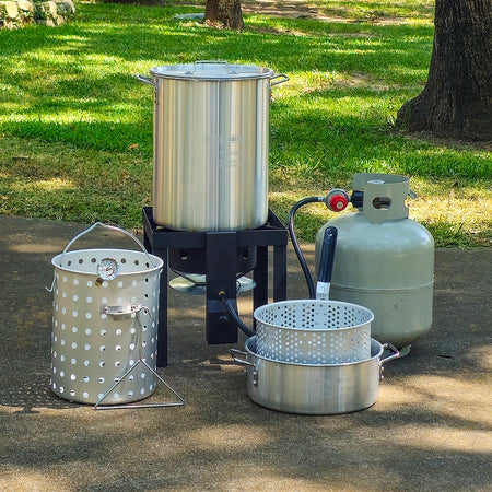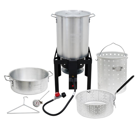 - Complete professional-grade aluminum cookware kit featuring 30 QT and 10 QT pots with durable frying/boiling baskets