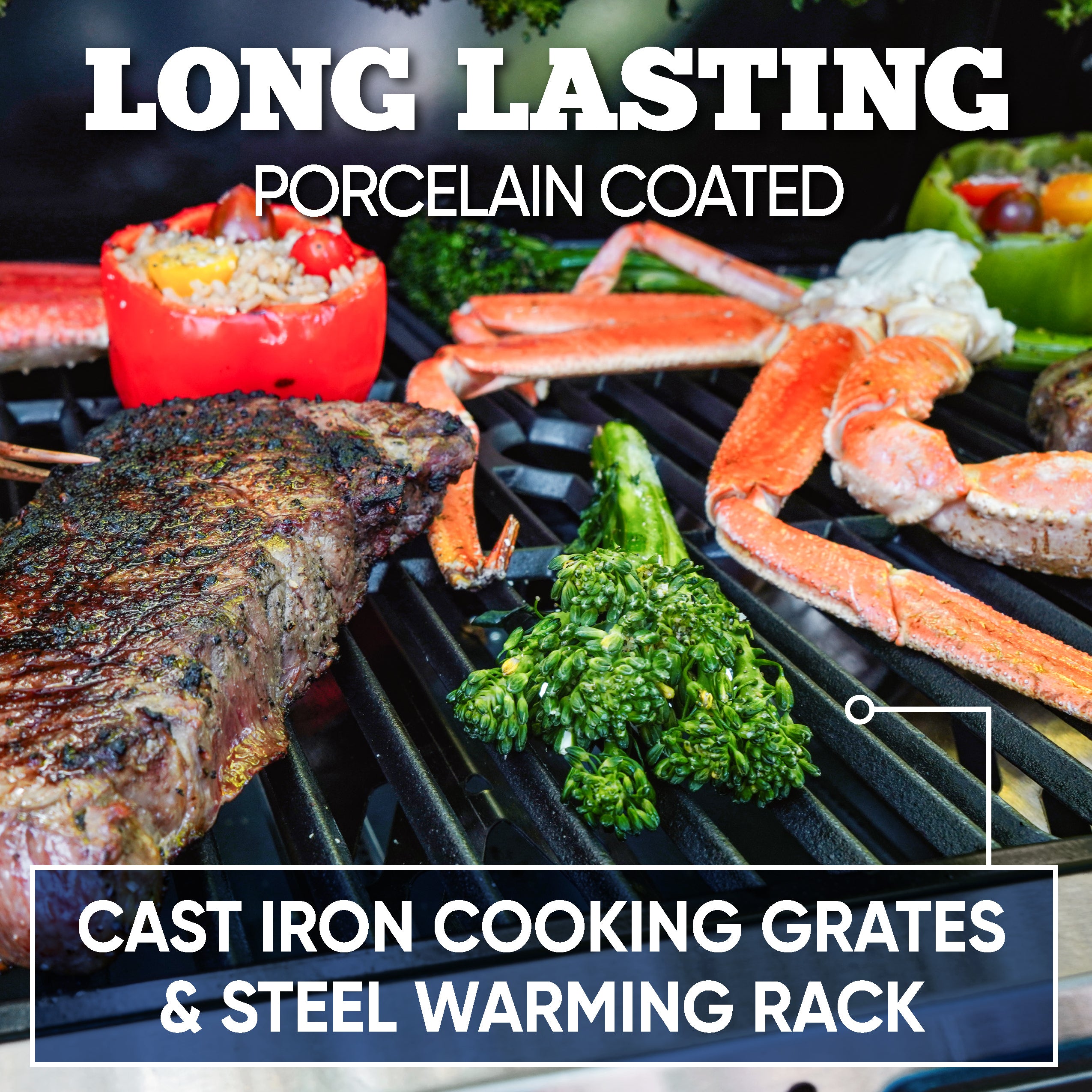 - Long-lasting porcelain-coated cast iron cooking grates for superior heat retention and easy cleaning