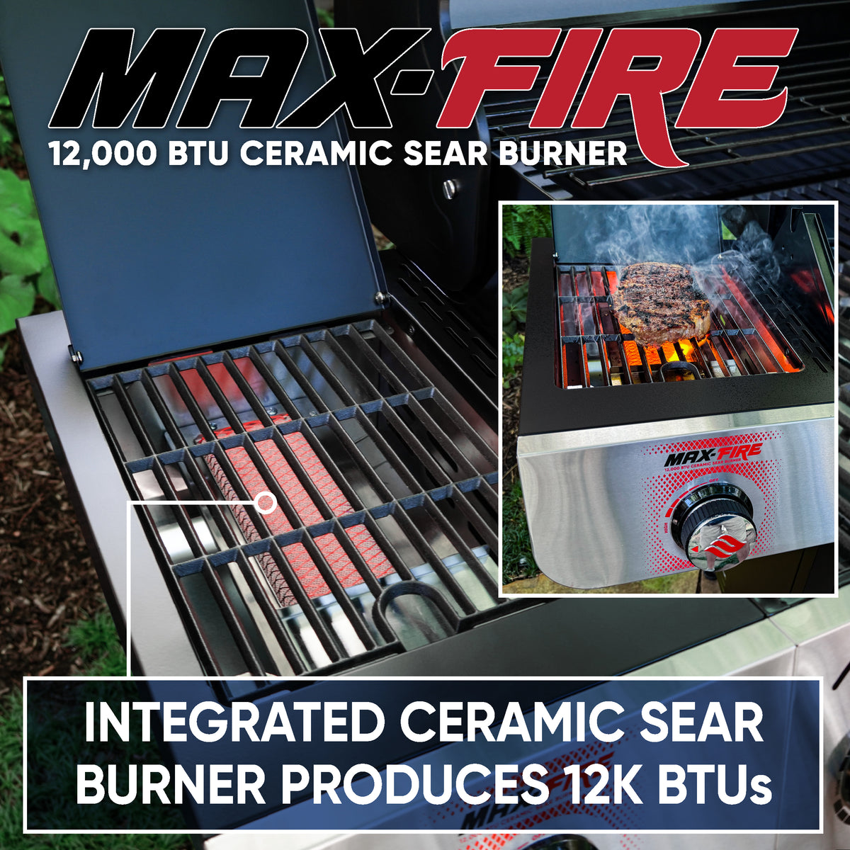 - 12,000 BTU ceramic Max Fire sear burner on the left side table for steakhouse-quality results
