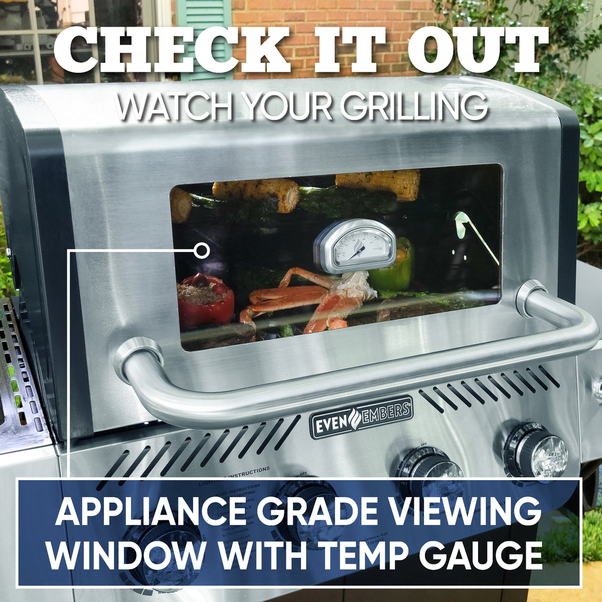 - Appliance-grade glass viewing window to monitor your grilling progress without lifting the lid