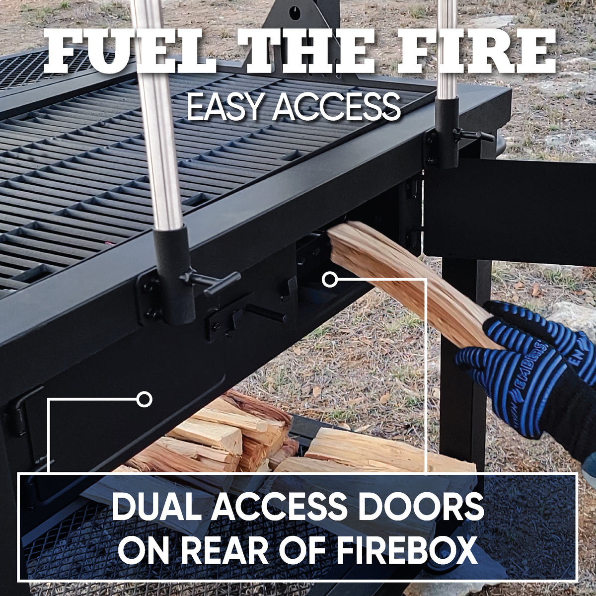 - Dual rear access doors: add or adjust fuel without disrupting your cook