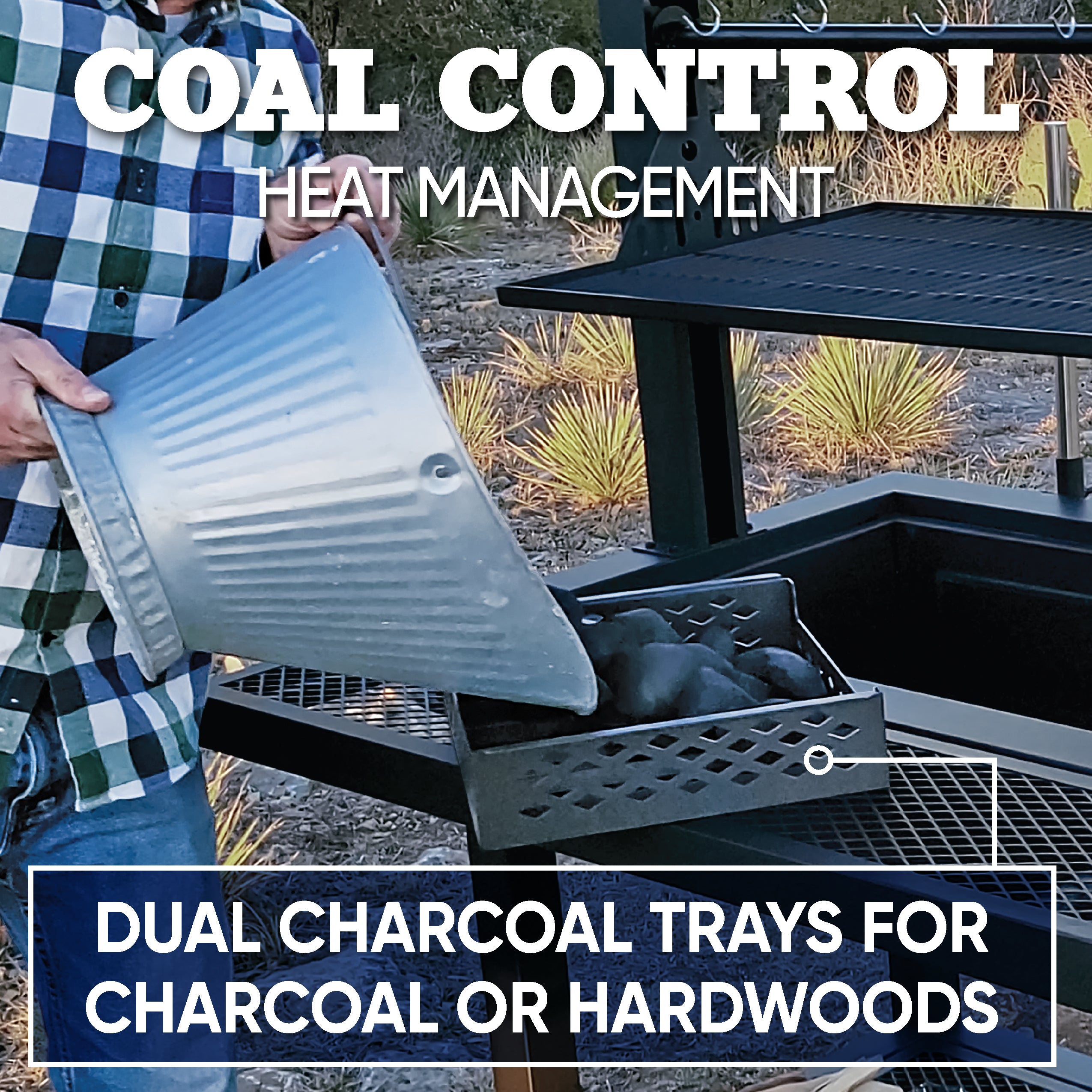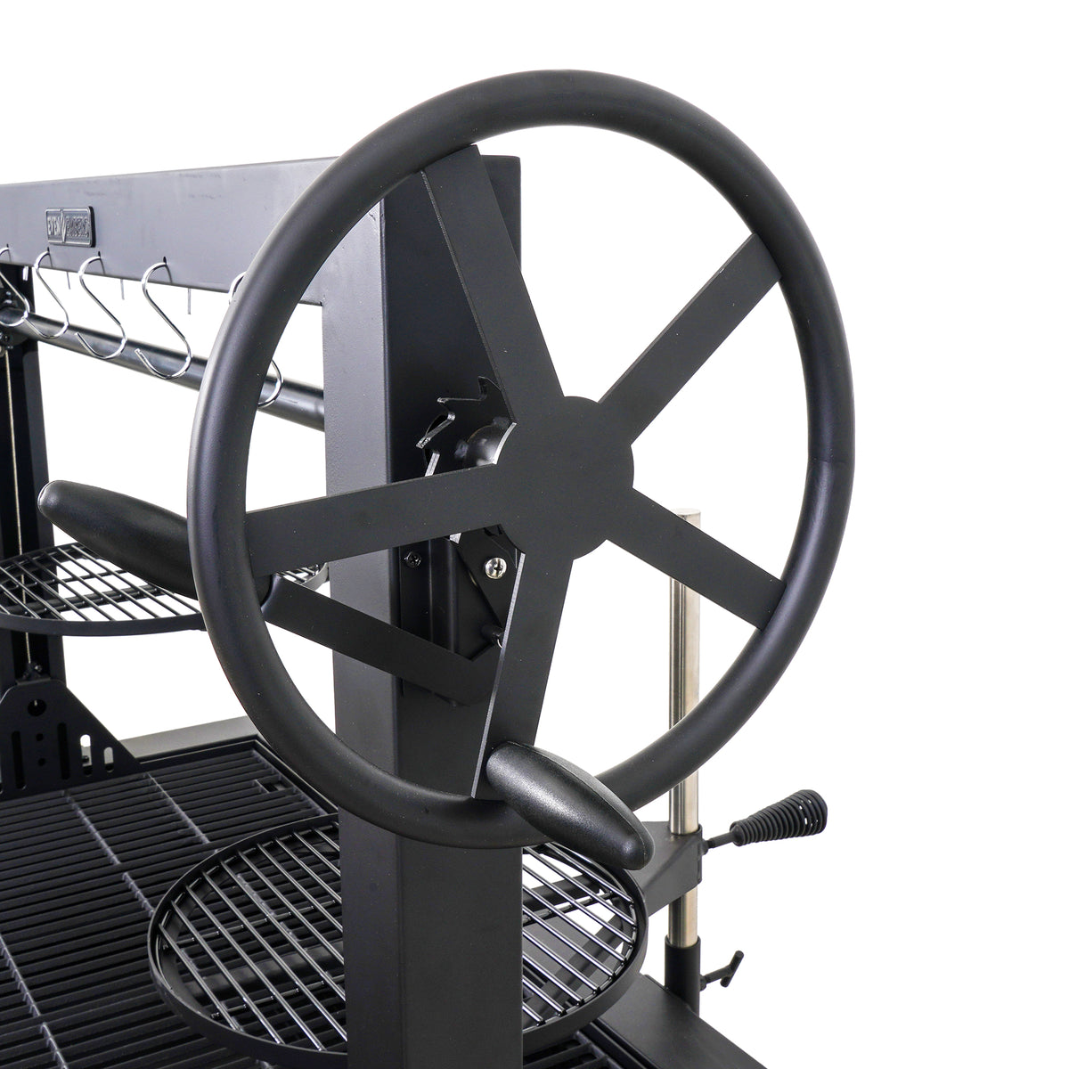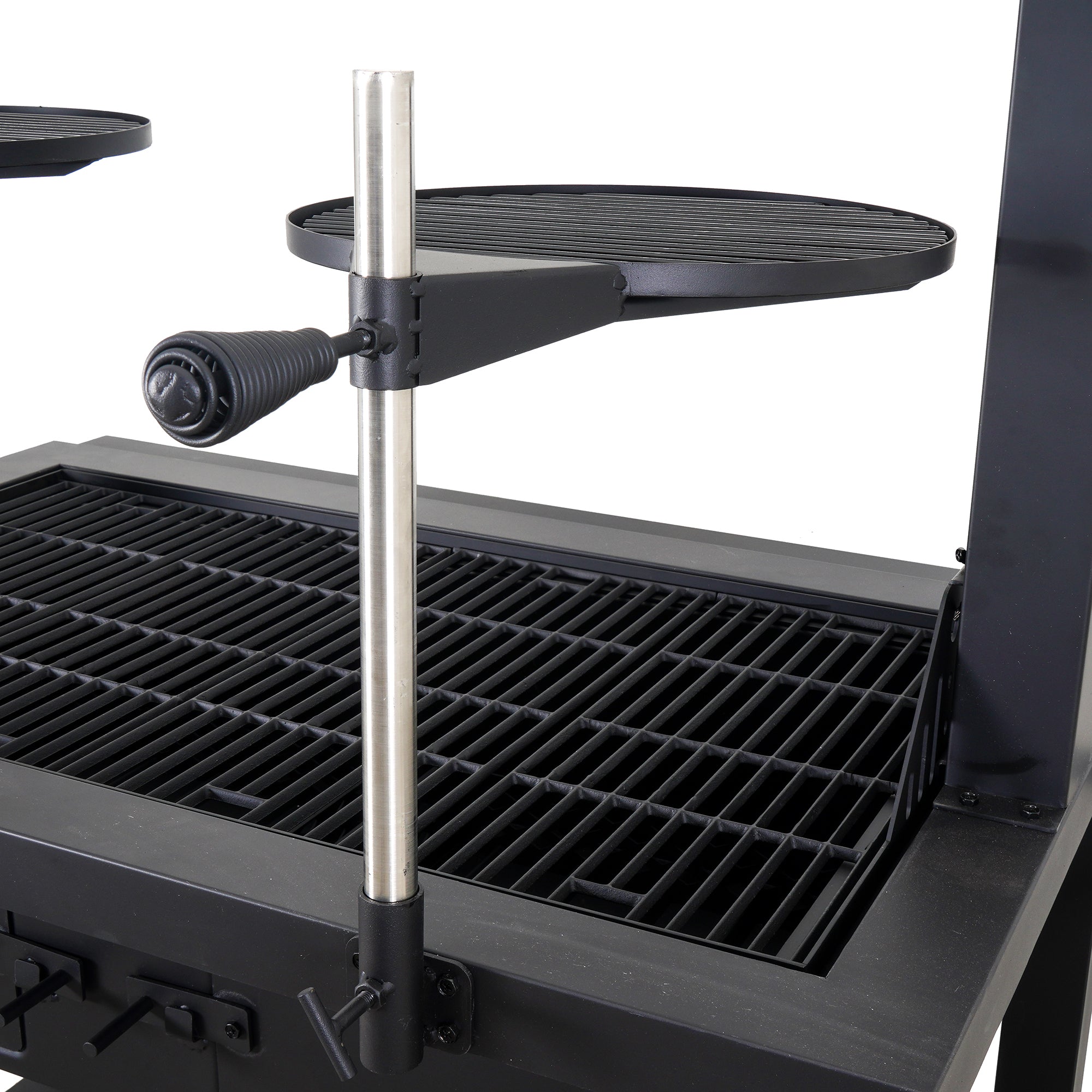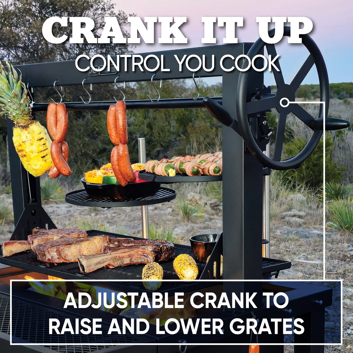 - Adjustable crank system: easily control heat by raising or lowering the grates