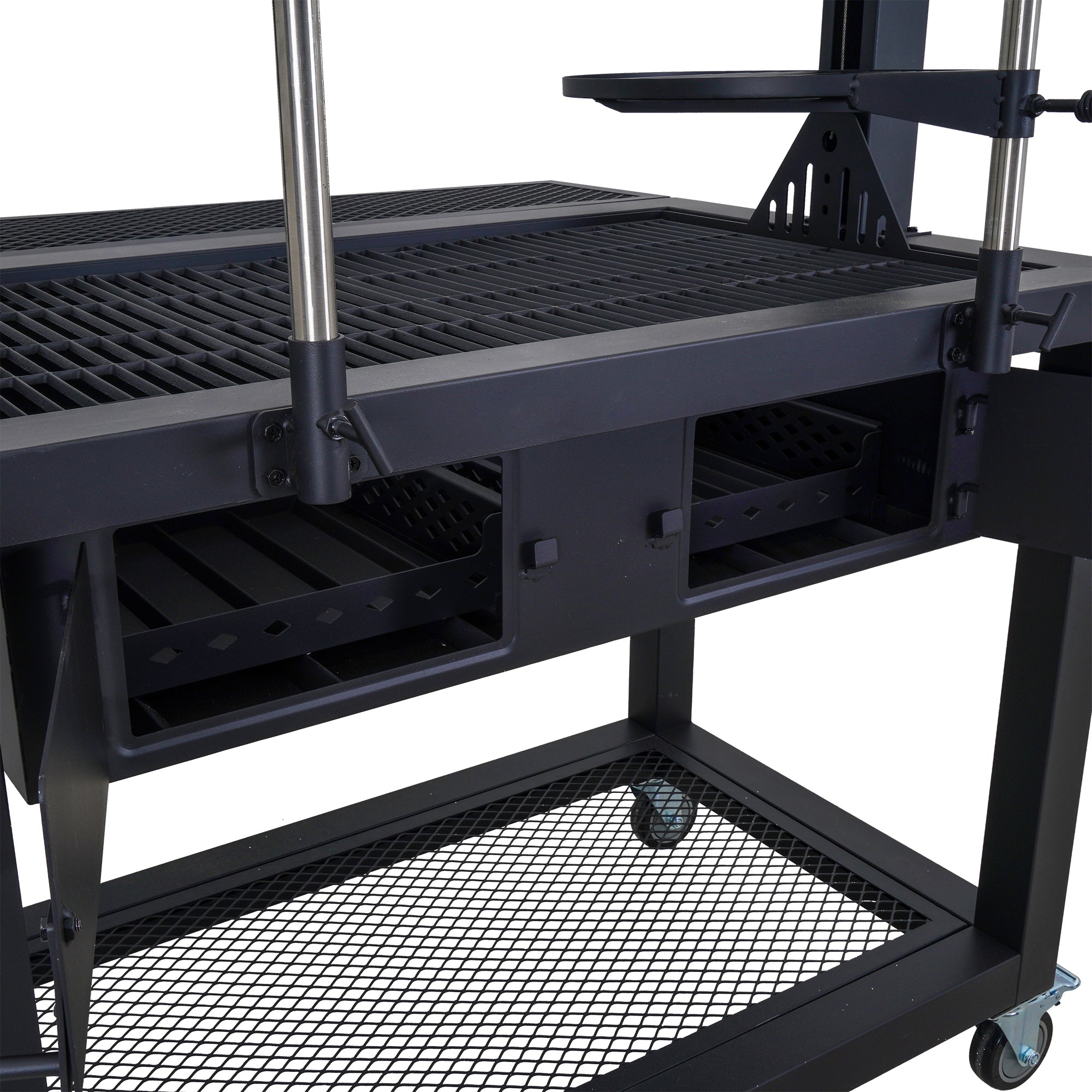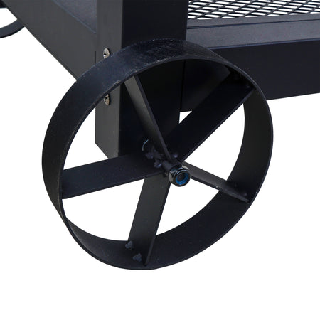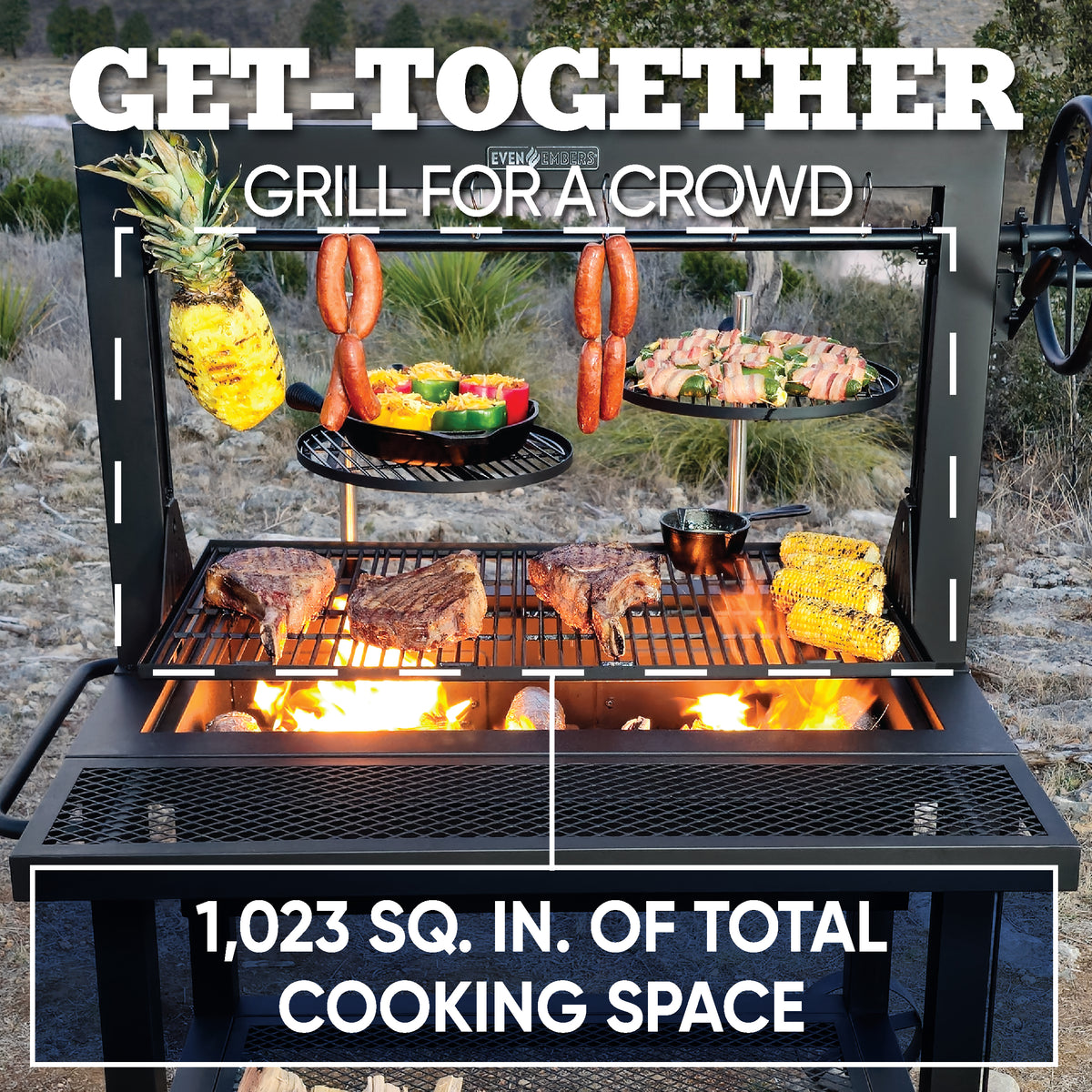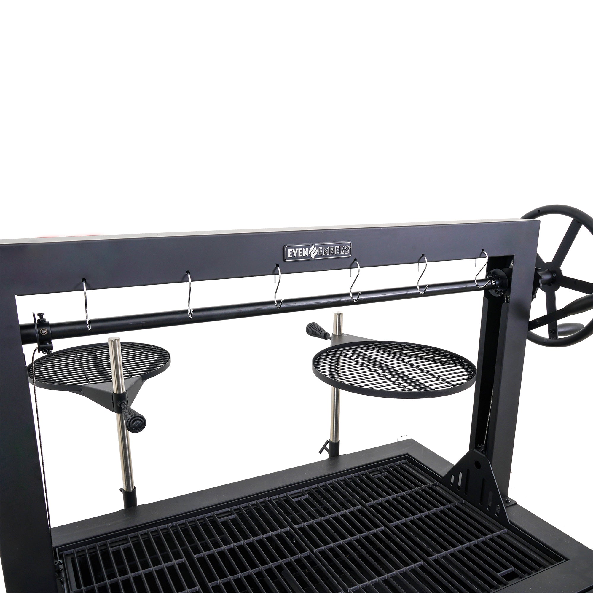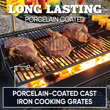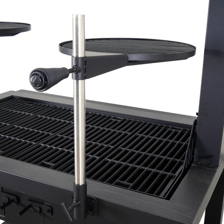Experience authentic Santa Maria-style grilling with the Even Embers Santa Maria Grill. With a spacious 1,023 square inches of total cooking area, including porcelain-coated cast iron grates and swing-away warming racks, this grill is ideal for entertaining and cooking large meals. The adjustable crank system allows you to effortlessly raise and lower the cooking grates, providing precision heat control for perfect searing or slow roasting. Constructed with heavy-gauge steel, this grill is designed for long-lasting performance. The dual access doors on the rear of the firebox make fuel management easy. Spacious firebox compartments accommodate an abundance of charcoal and/or wood without disrupting your cooking process. Additional features such as dual charcoal baskets & trays, a foldable front table, 6 sausage hooks, and large steel caster wheels ensure convenience and easy maneuverability. Includes a custom fitted 400D all-weather grill cover. Whether you're cooking over open flames or mastering traditional Santa Maria-style grilling, this premium grill delivers superior results every time.